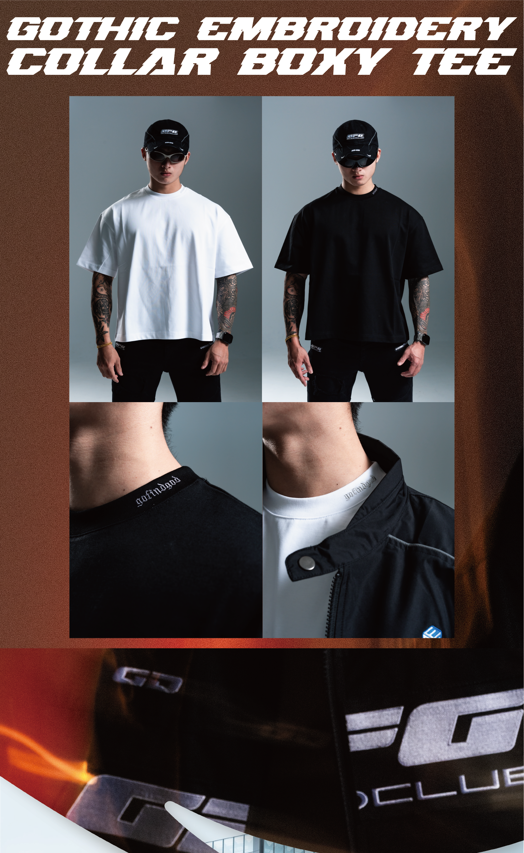 - 細節收斂在領口—低調置入 gofindgod 歌德體電繡,不搶眼,卻足夠被看見,為整體留下關鍵識別,點出屬於 GFG 的高質感街頭氛圍。